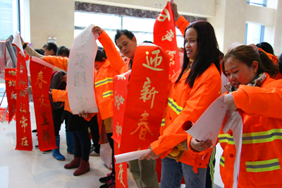 “春满人间百花吐艳 福临小院四季常安” “一帆风顺年年好 万事如意” ……1月26日至28日,丽汇大厦一楼热闹非凡,为了感激社会各界对星空官方网页版-星空(中国) 的关心与支持,由星空官方网页版-星空(中国) 工会组织的书法家“迎新春 送祝福”义务送春联活动吸引了大量前来求墨宝的社会各界人士。三位南宁市书法协会的书法家以及南宁科巨公司副总经理陆章发为观众们现场挥毫,一幅幅金烫烫、散发着墨香的春联映衬着人们的笑脸,整个现场弥漫着浓浓的年味,短短三天时间便送出了2000多副春联。1月26日上午,星空官方网页版-星空(中国) 工会还启动了派送春联仪式,星空官方网页版-星空(中国) 工会主席黄丽琴带领工会人员将春联送到经开区40余位保洁人员、园林绿化工人、公司职工的手上。(张彩秀/文、图)
