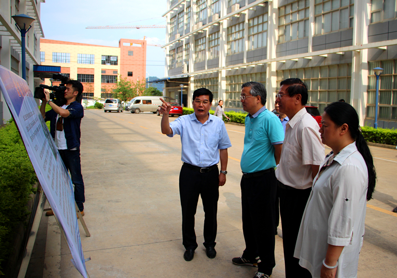 经开区党工委书记、管委会主任何尚汉(左一)向周红波市长(中)介绍金凯工业园企业进驻情况