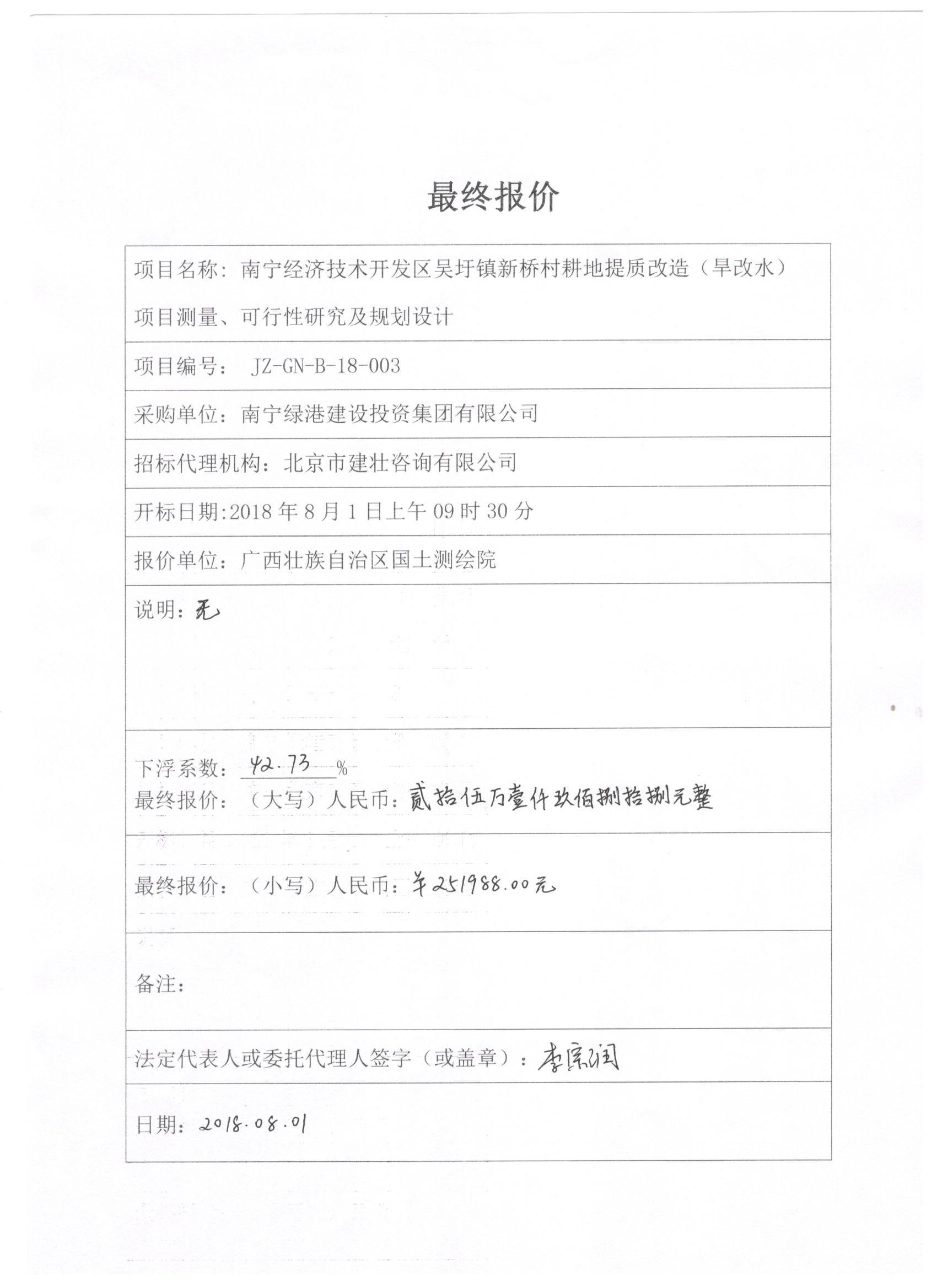 北京市建壮咨询有限公司受星空官方网页版-星空(中国) 委托,根据《中华人民共和国政府采购法》等有关规定,于2018年8月1日就南宁经济技术开发区吴圩镇新桥村耕地提质改造(旱改水)项目测量、可行性研究及规划设计以竞争性磋商方式进行采购,现就本次采购的成交结果公告如下: