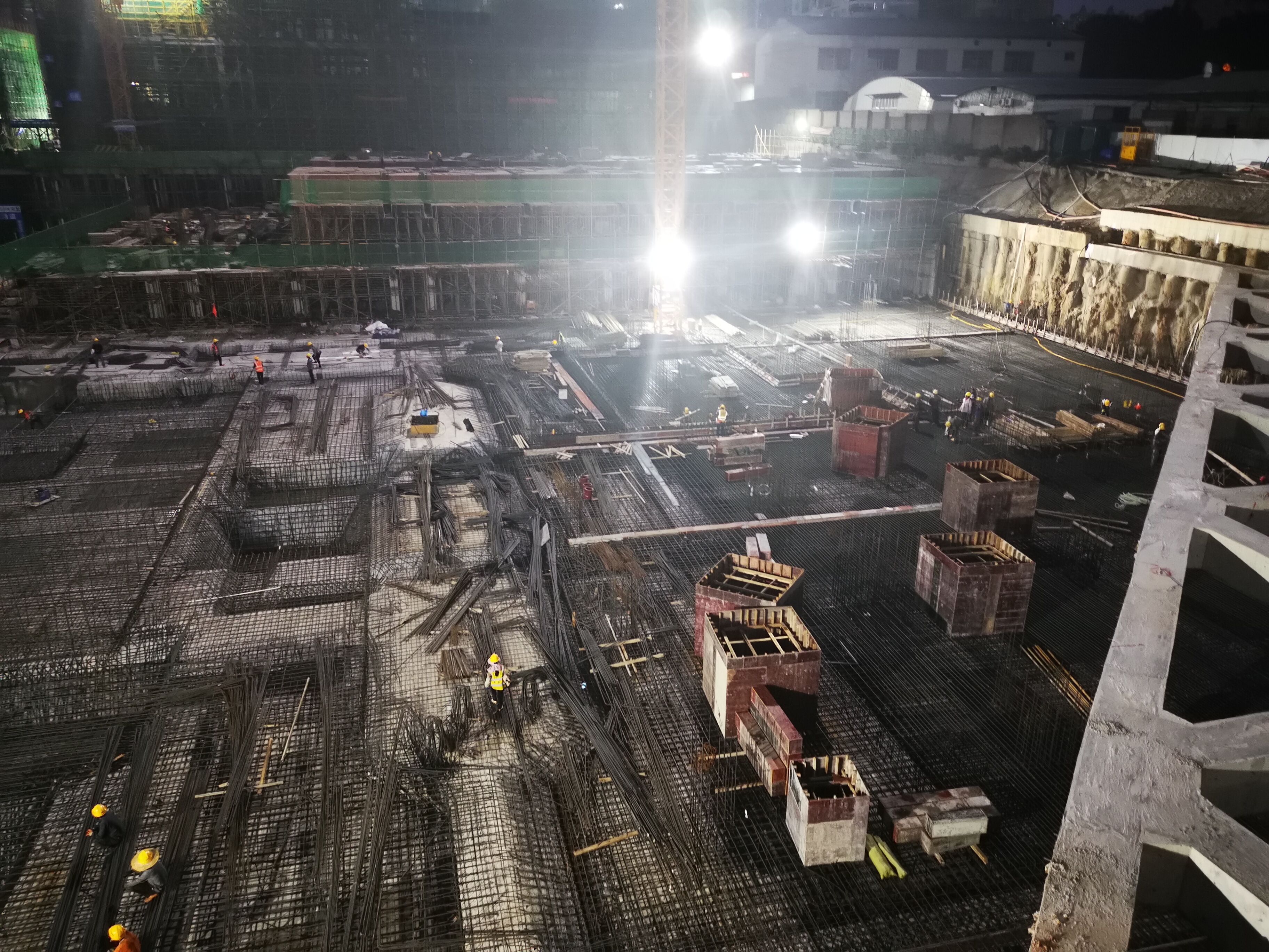 2021年2月底收到支护桩和水平混凝土支撑梁施工图纸后,项目推进小组立即组织项目部结合雨季施工特点制定科学合理的抢工方案,倒排工作计划、细化实施方案、强化责任落实,能早则早、能快则快。因项目处于闹市,抢工首要解决的就是施工扰民问题。在推进小组组长、嘉通公司副总经理何小勇带领下,相关组员主动加强与建设行政主管部门和环保部门沟通,说明、强调项目抢险的必要性,尽快征得了相关部门的许可,部分施工内容顺利得以24小时连续施工。分管该项目的嘉通公司工程一部副经理秦桂畅积极发挥自己的沟通协调能力,帮助施工单位主动与社区、周边居民沟通,取得各方理解,以保障抢工计划顺利开展。项目业主代表赵政生根据现场施工实际情况,组织各方会议及时沟通调整,合理安排施工工序,尽可能将产生噪音的工作安排在白天进行。同时,抢工阶段正值南宁的雨季,推进小组加强雨季施工组织,协调施工单位在雨天安排受雨水影响较小的工作,项目现场形成了“大雨小干,小雨大干,不下雨拼命干”的局面。尤其是在土方外运期间,要求施工单位协调各方关系,调配工料机的关系,天晴做到“人停机不停”的抢工状态。各项措施保证了项目在两个月的时间里基本保持在24小时抢工状态,通过推进小组及参建单位夜以继日的努力,2021年4月20日项目西北角新增72根支护桩、水平混凝土支撑梁以及50000m³土方外运工作得以完成。