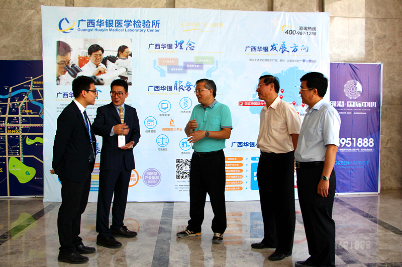 周红波市长(中)视察位于绿港国际中心B4栋的广西华银医学检验所,与企业负责人亲切交谈
