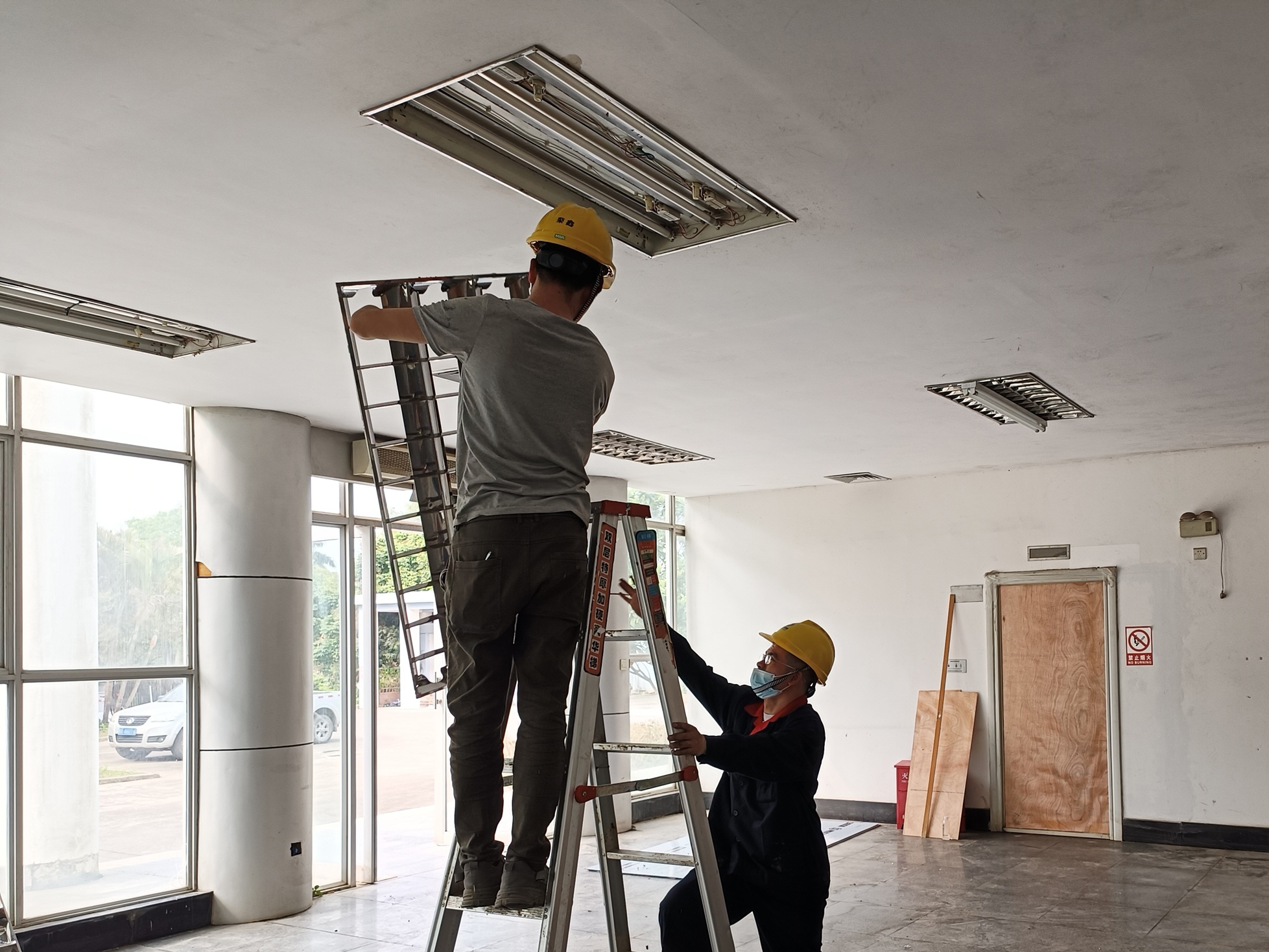 19日上午6时,37个施工人员集结到了联检楼大院内,他们开始对硬化的混凝土地面进行保养,同时完成大楼内的水电管线安装和门锁、电灯等配套设施的安装工作。